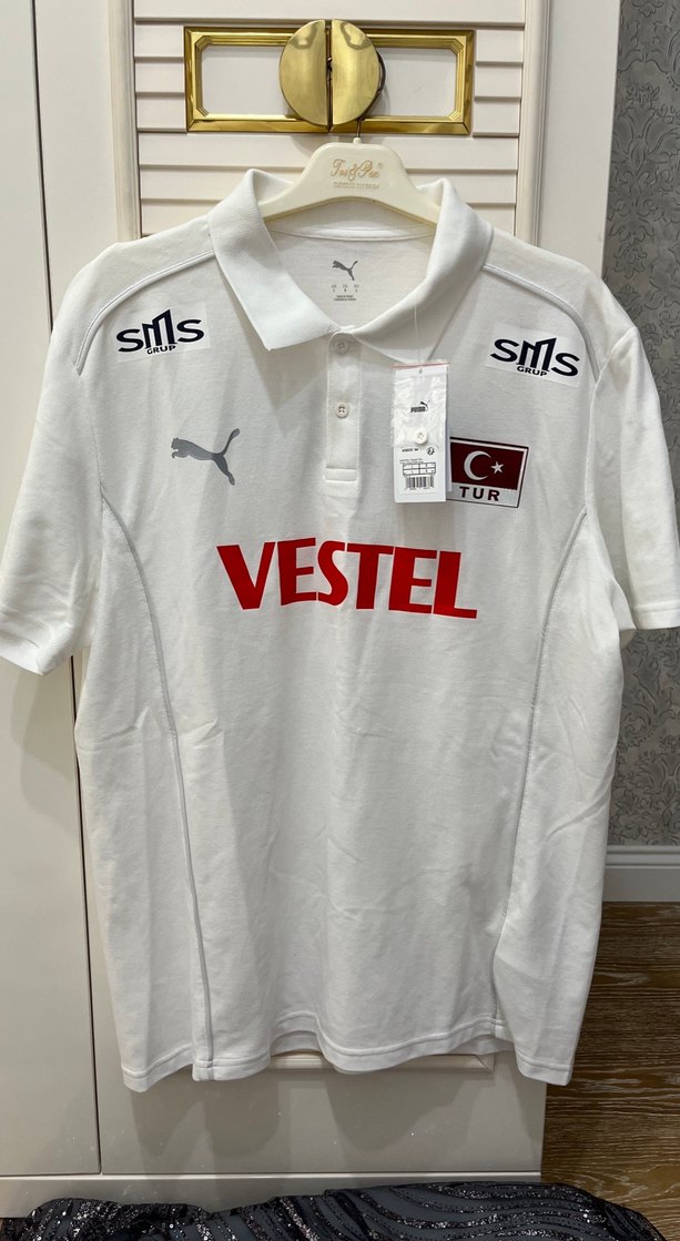 Beyaz renk, polo yaka ve kısa kollu erkek tişörtü. Sentetik kumaştan, bol kesim ve normal boyda. Baskılı logo ve cırt cırt detay içerir. Spor ve günlük kullanıma uygun. ♂️
