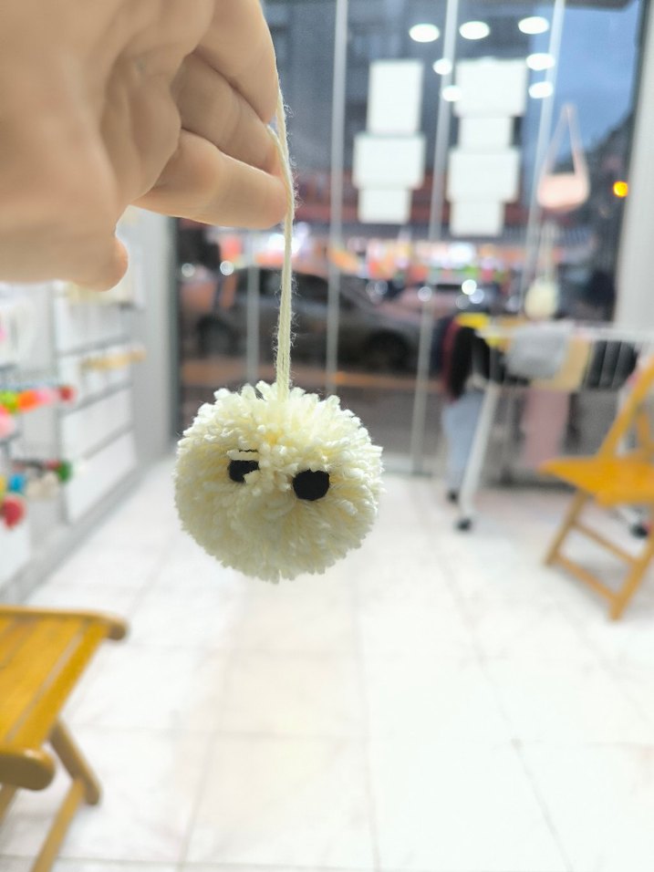 Siyah gözlü, ip ile asılan yumuşak beyaz ponpon peluş oyuncak. Renkli ve kabarık yapısıyla eğlenceli bir aksesuar.