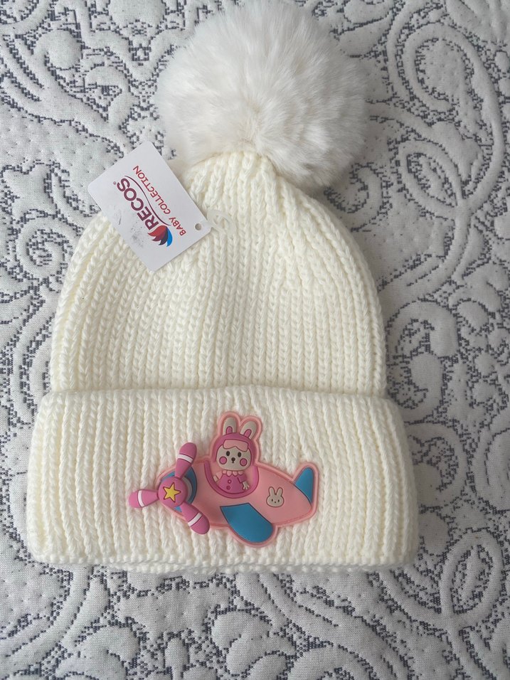 Yumuşak ponponlu beyaz örgü çocuk beresi, renkli nakışlı uçak figürüyle hareketlendirilmiş. Sıcak ve eğlenceli tasarım. ❄️