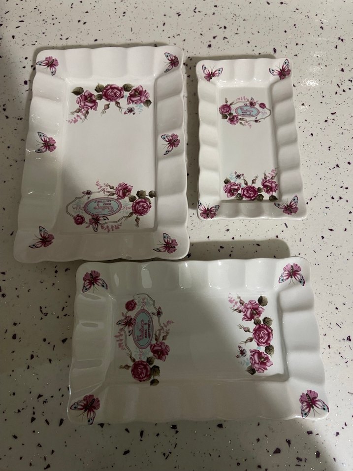 Beyaz porselenden yapılmış, çiçek desenli ve dalgalı kenarlı servis tabakları setidir.