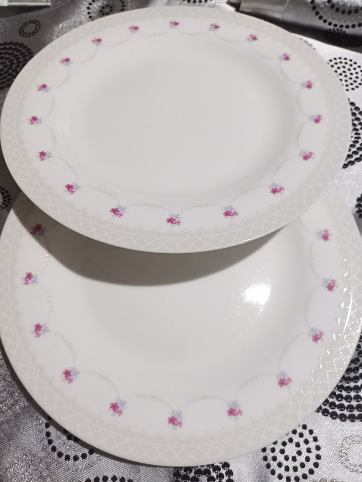 Kenarlarında ince pembe çiçek desenleri bulunan beyaz porselen tabaklar. Düz yüzeyli ve zarif detaylara sahiptir. ️