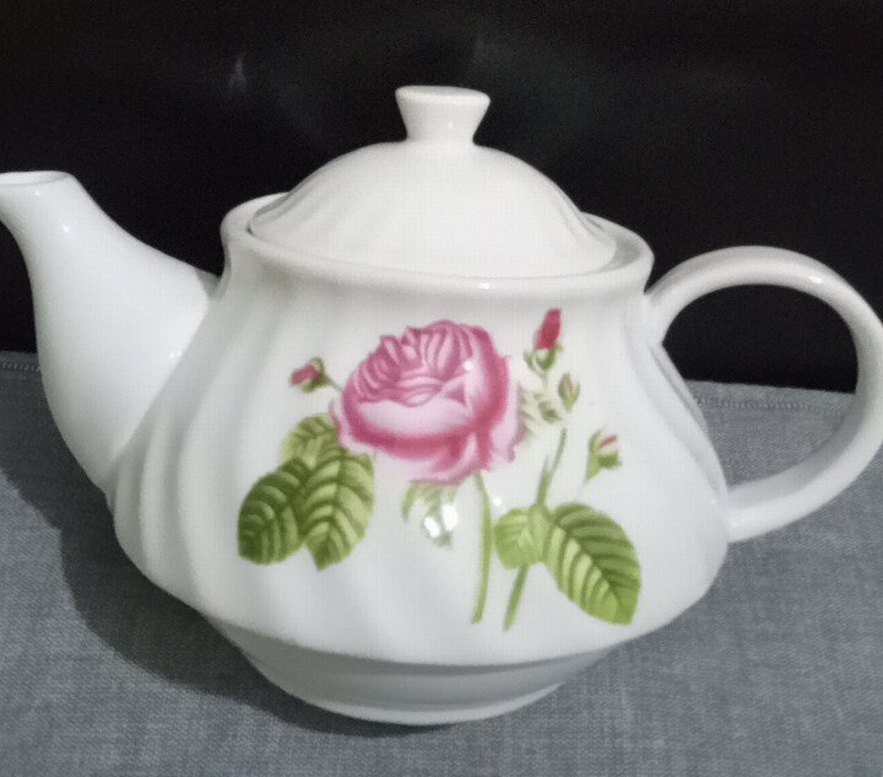 Beyaz porselenden yapılmış, renkli pembe gül ve yeşil yaprak desenli çaydanlık. Kapağı ve kulpu ile klasik tasarım. Hiç kullanılmadı, işaretli yerde imalat kaynaklı belli- belirsiz leke var.