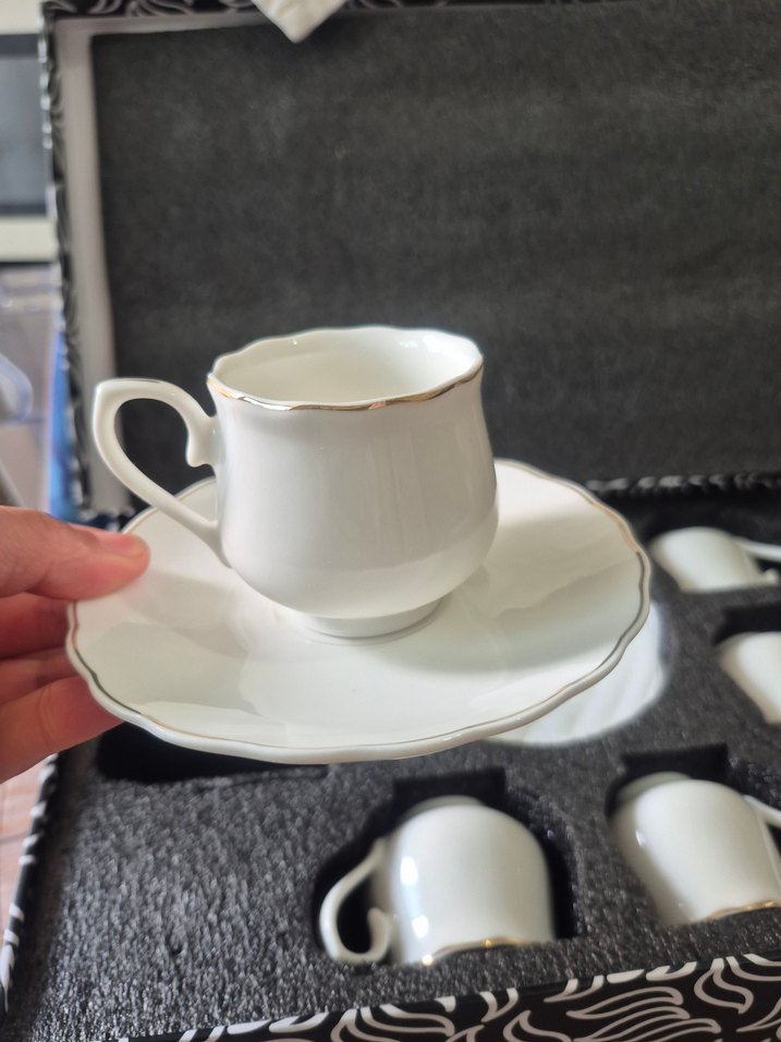 gold ince kenarlı beyaz porselen fincan ve tabak seti, kıvrımlı kulplu, dalgalı kenarlı.