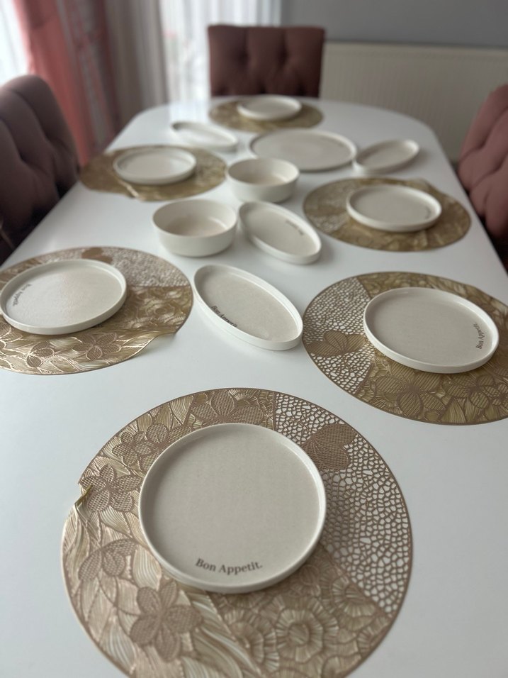 Üzerinde 'Bon Appetit' yazısı bulunan beyaz porselen kahvaltı ve sunum tabakları seti, yemek servisi için uygundur. ️ 4 adet kayık tabak 6 adet pasta tabagı 1 adet supla 2 tane sunum kasesi Bellamoison marka