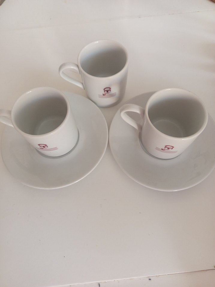 Üzerinde küçük bir logo bulunan, 2 adet kahve fincanı ve tabaklarından oluşan beyaz seramik set. ☕bir tane tek yedek fincan tabaksız