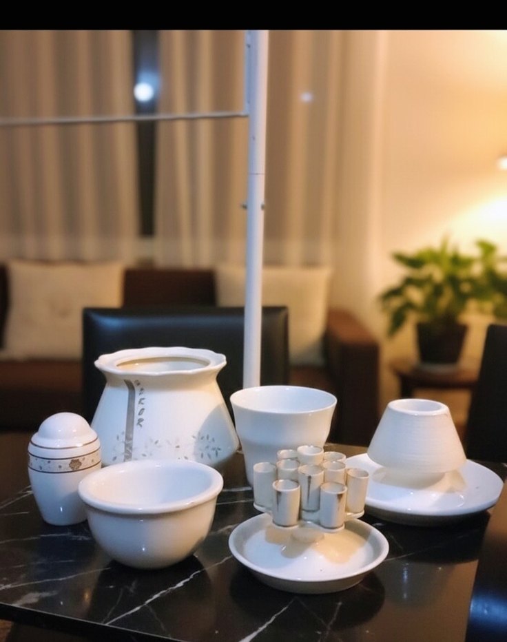 Beyaz porselen den yapılmış, desen içermeyen klasik tarzda çeşitli kase, şekerlik ve mumluk içeren sofra takımı. ️ hepsinin toplam fiyatıdır