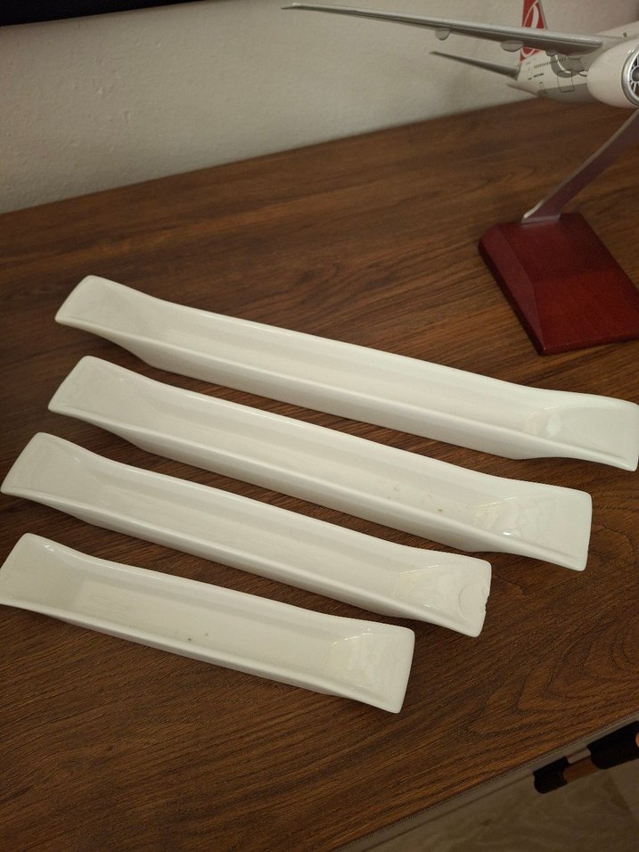 Beyaz porselenden yapılmış, uzun ve ince servis tabakları seti, zarif sunumlar için uygundur. ️birinde ufak bir atık var