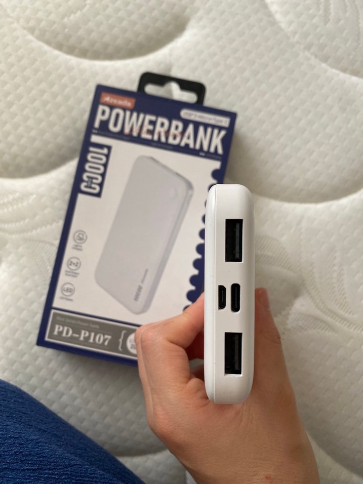 Beyaz renkli PD-P107 powerbank, 10000mAh kapasite ve iki USB ile bir USB-C portu sunar.