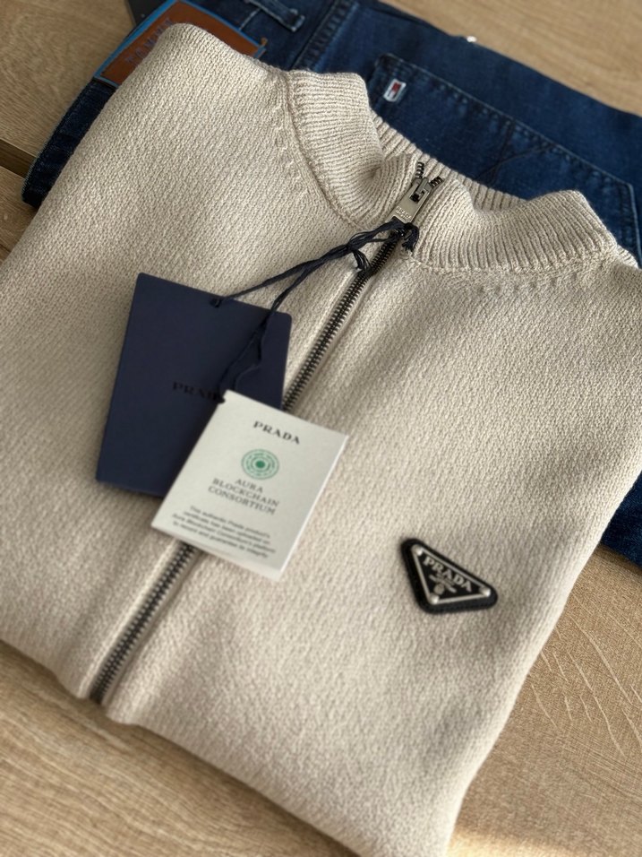 Önden fermuarlı, göğsünde Prada rozeti bulunan, rahat dokulu erkek triko . Trendy ve rahat sokak giyimi için uygundur.