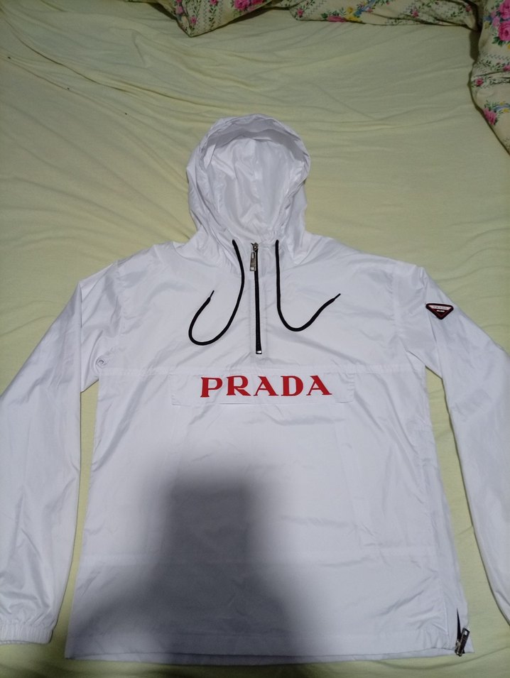 Uzun kollu, kapüşonlu ve fermuarlı detaylı, baskılı PRADA logolu beyaz yağmurluk.Hiç kullanılmadı. (Orjinal değildir) fakat Kalitelidir. L Beden, Defosuz.