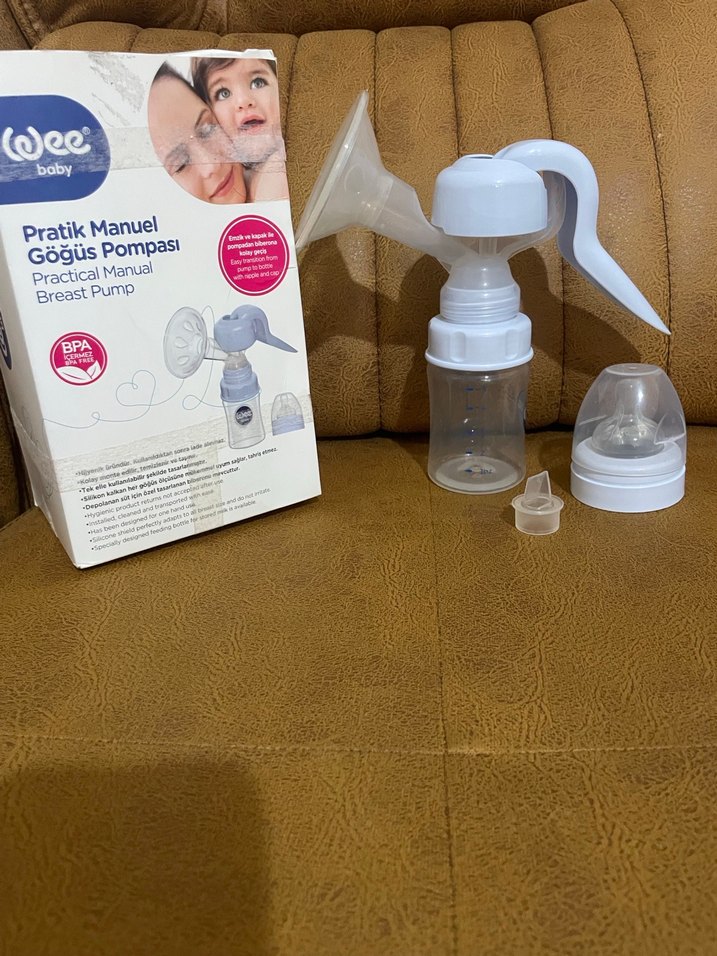Beyaz renkte, kullanımı kolay pratik manuel göğüs pompası. BPA içermez ve rahat tutma kolu ile süt toplama şişesi bulunur.