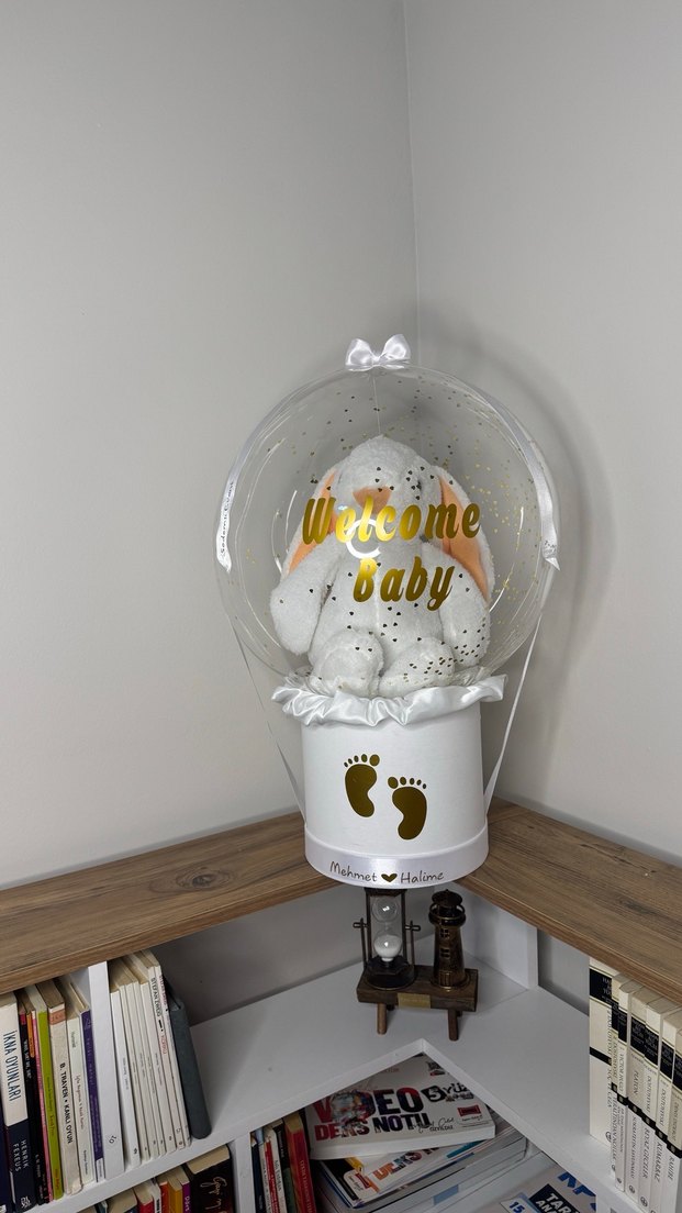 Renkli tasarımlı beyaz Bebek için Bobo baalon, üzerinde 'Welcome Baby' yazısı ve küçük ayak izleri bulunur, içinde peluş tavşan ile. Kişiye özel dilediğiniz renk ve modelde yapılır. Fiyat için lütfen mesaj atınız.