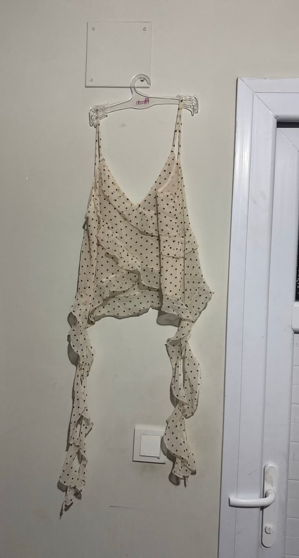 Beyaz, açık renk puantiyeli mini yelek, halter yaka ve drapeli tasarıma sahip, bol kesim, sentetik kumaştan üretilmiştir.