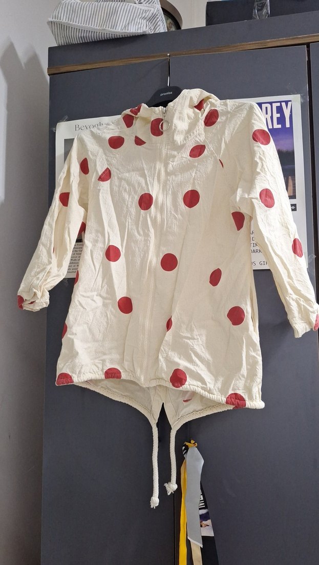 Düğmeli, bol kesim kız çocuk yağmurluğu, hafif pamuklu kumaş ve kırmızı puantiyeli baskıya sahip. Yuvarlak yakalı, sokak modasına uygun bir tasarım. ️