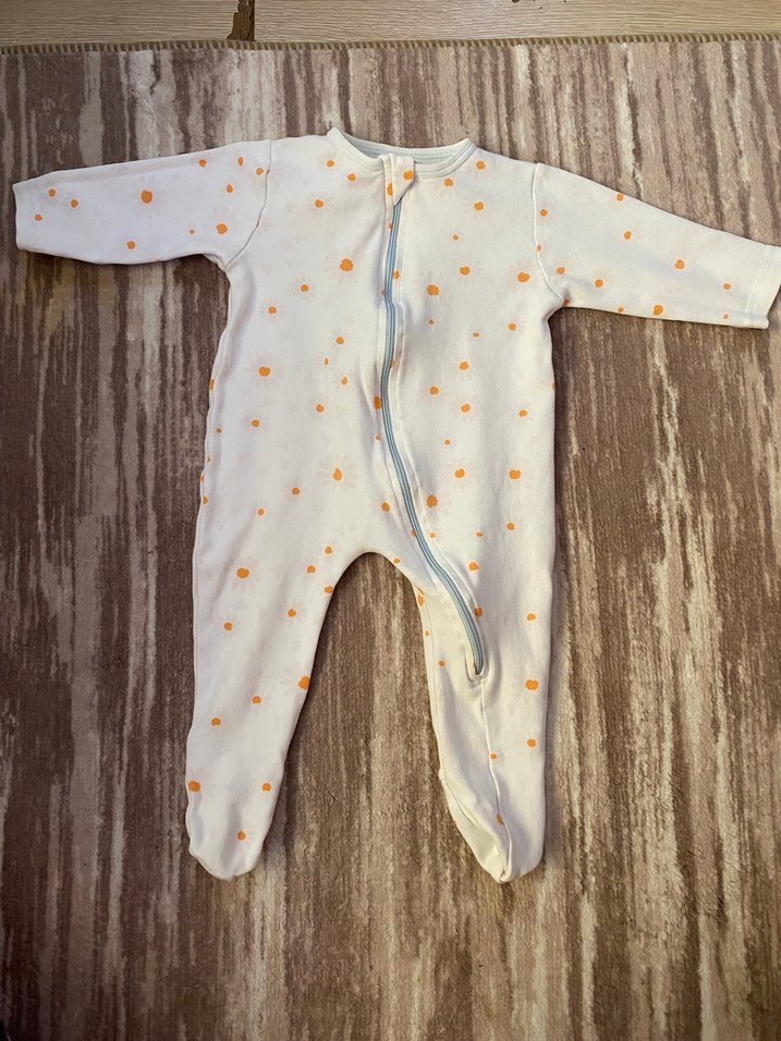 Yumuşak kumaşlı, uzun kollu ve fermuarlı bebek tulumu. Pastel beyaz zemin üzerinde turuncu puantiyelerle sade bir tasarım sunar.