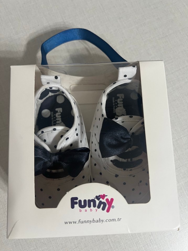 Beyaz zemin üzerine siyah puantiyeli, siyah fiyonk detaylı, kauçuk malzemeden yapılmış ilk adım ayakkabısı. Trend sokak tarzı için uygundur.