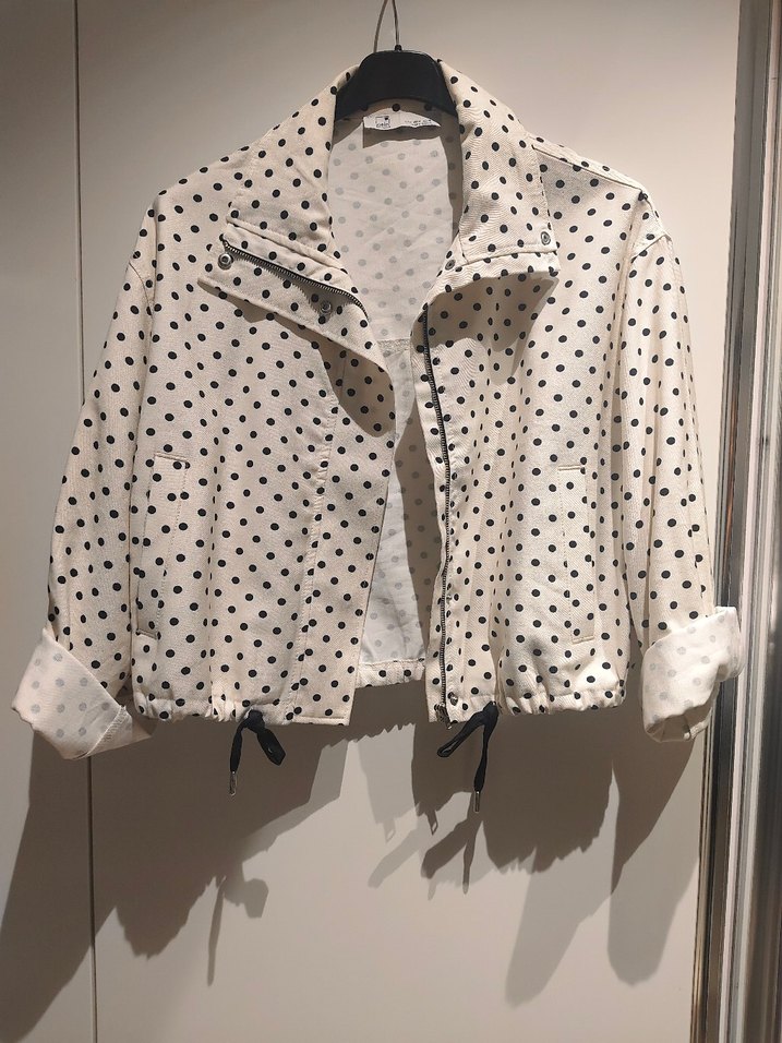 Siyah puantiyeli, uzun kollu, bol kesim beyaz mini ceket. Sentetik kumaştan, düğmeli ve yakalı, gündelik sokak stili için uygun.