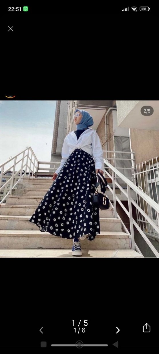 Pamuklu kumaştan, beyaz puantiyeli koyu renk, bol kesim ve drapeli uzun etek, sokak stiline uygun.