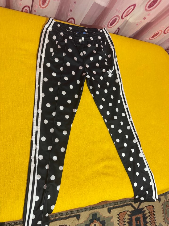 Beyaz puantiyeli, yanları çizgili siyah dar kesim eşofman, esnek sentetik kumaştan rahat ve şık. Günlük kullanıma uygun.