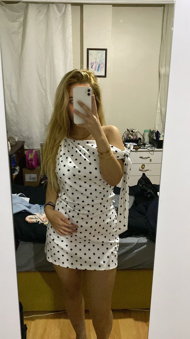 Beyaz zemin üzerine siyah puantiyeli, straplez ve vücuda oturan mini elbise. Pürüzsüz sentetik kumaştan, minimal ve cesur sokak stili sunar. Kolsuz ve şık akşam yemekleri davetler için uygun, zahmetsiz şıklık sağlar.