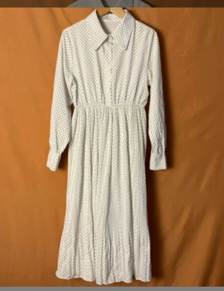 Yumuşak saten pamuk kumaştan, uzun kollu ve yakalı, bol kesim beyaz puantiyeli, pileli uzun elbise. Vintage bohem tarzı için uygundur.