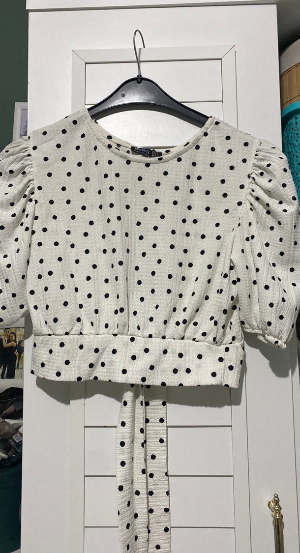 Beyaz, puantiyeli, uzun kollu ve bisiklet yaka, düğmeli, belden bağlamalı, sentetik kumaştan, dar kesim kadın bluz.