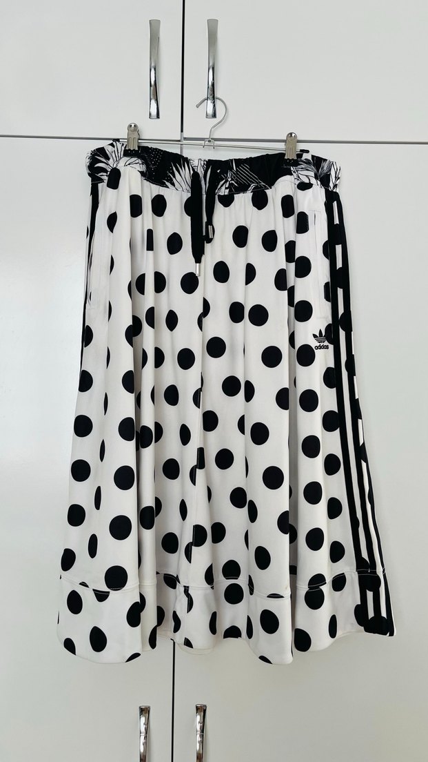Beyaz zemin üzerine büyük siyah puantiyelerle desenlenmiş, pilili ve bol kesimli uzun etek. Sentetik kumaştan üretilmiş, günlük kullanıma uygun sokak stili ve avangart tasarım.