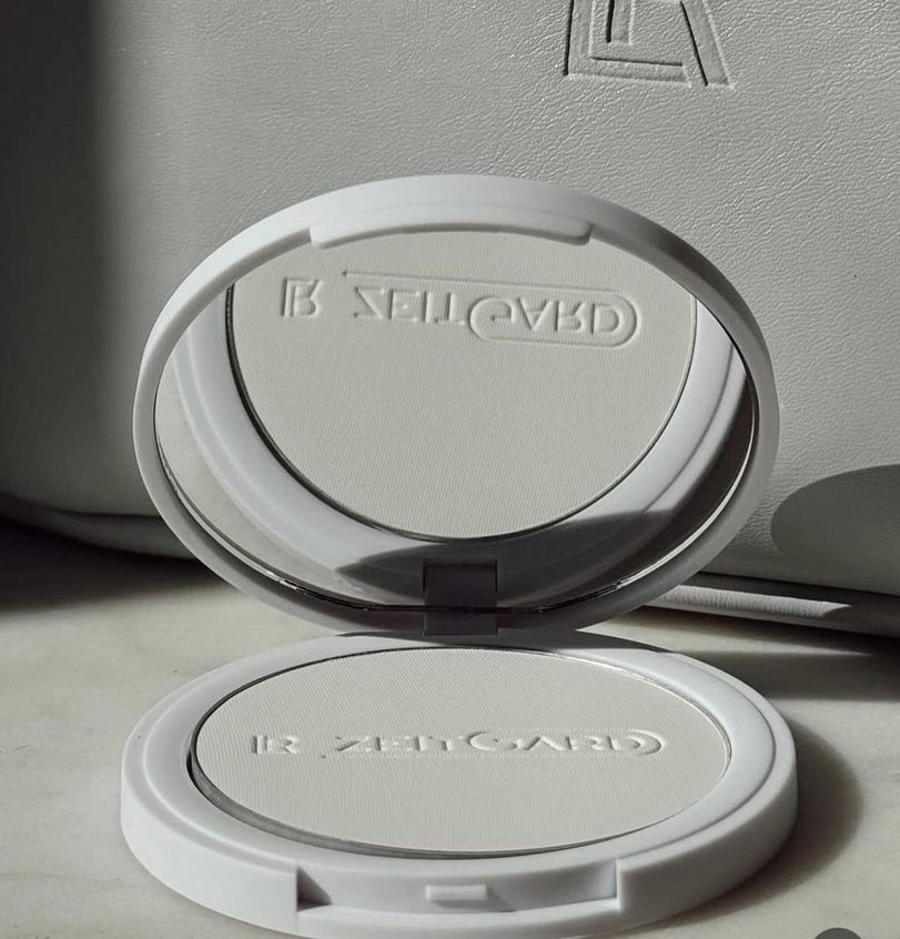 İçinde ayna bulunan beyaz kompakt pudra. Pürüzsüz dokusu ve hafif gri tonuyla dikkat çeker.