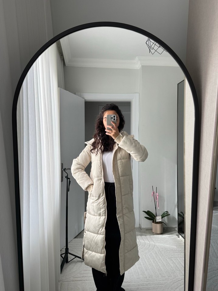 Beyaz, puff detaylı, uzun kollu ve yüksek yakalı kadın kış montu. Midi boyda, sokak stiline uygun ve sıcak tutan yumuşak dokulu bir üründür. ❄️ görselde göründüğü gibi önde sağ alt tarafta hafif siyah lekeleri var ben temizlemedim ama yıkanınca çıkar diye düşünüyorum