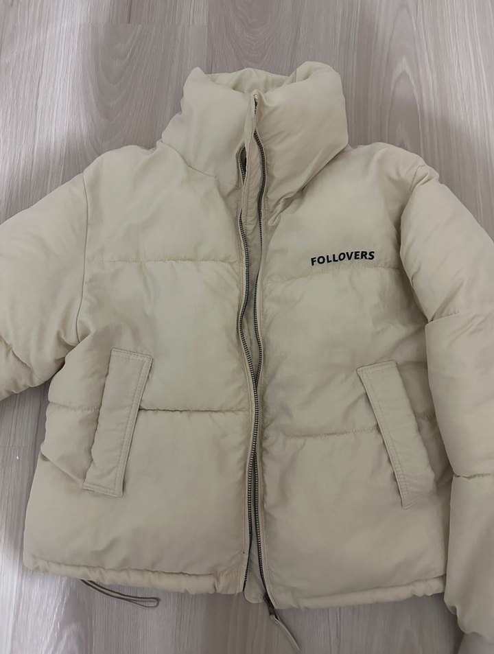 Yüksek yakalı, uzun kollu, yumuşak ve sıcak dokulu beyaz puff mont. Göğüs kısmında "FOLLOVERS" yazısı bulunur.
