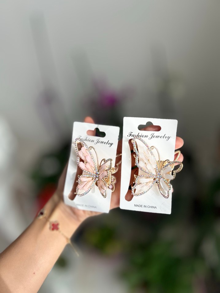 Beyaz pul detaylı kelebek saç tokaları, plastik malzemeden, bohem ve gösterişli stile sahip. Marka: FashionSewelry.