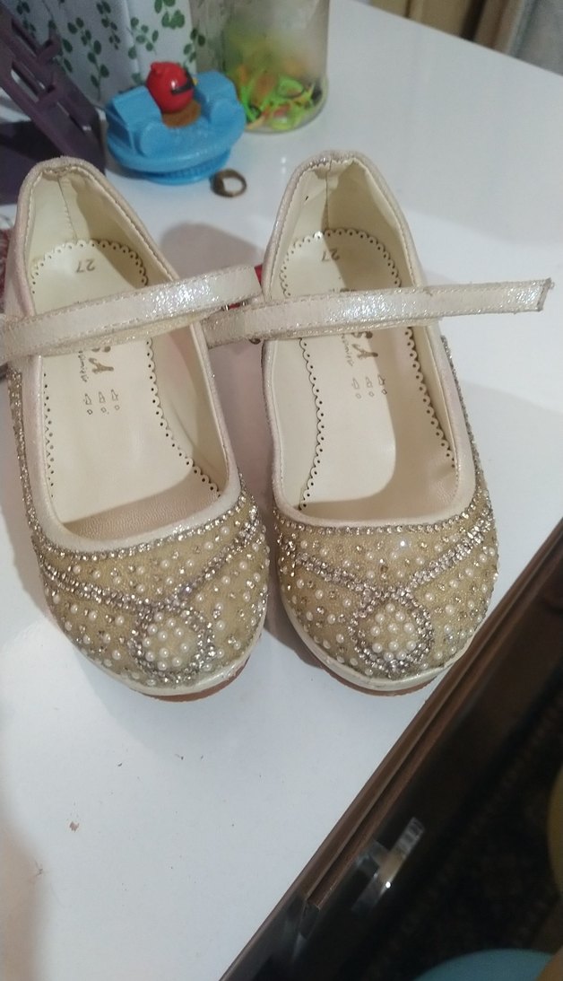 Beyaz, hafif yılan desenli kız çocuk babeti. Pul işlemeli ve kauçuk tabanlı, klasik bantlı model. ✨
