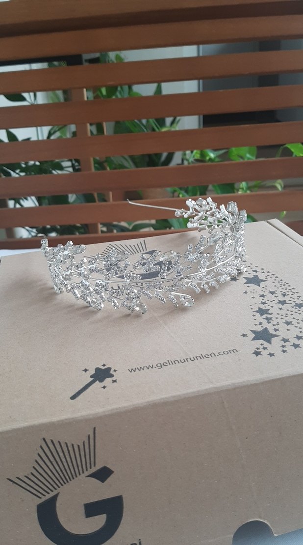 Beyaz pul işlemeli, çağdaş tasarımlı düğün tacı, klasik görünüm için zarif yaprak desenleri içerir.