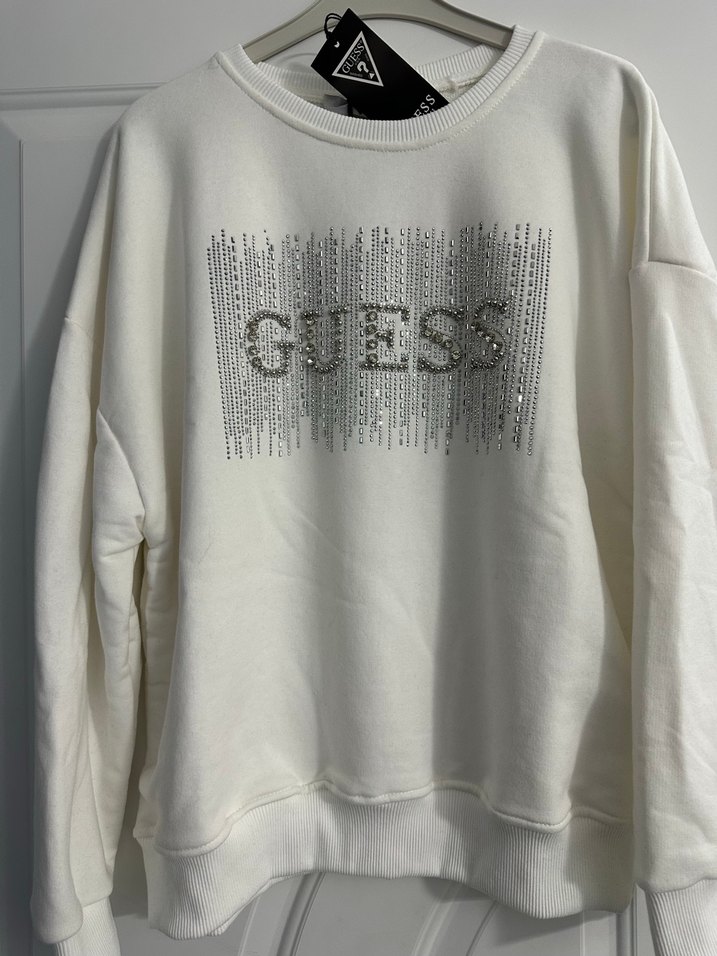 Pamuklu kumaştan beyaz Guess sweatshirt, uzun kollu ve bisiklet yakalıdır. Önünde parlak pul işlemeli logo baskısı vardır, rahat ve şık bir görünüm sunar. S-m-l bedene olur ✨