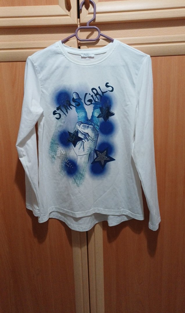 Pamuklu, beyaz uzun kollu kız tişörtü, bol kesim. Pul işlemeli yıldıza ve el baskısına sahip, yuvarlak yaka.