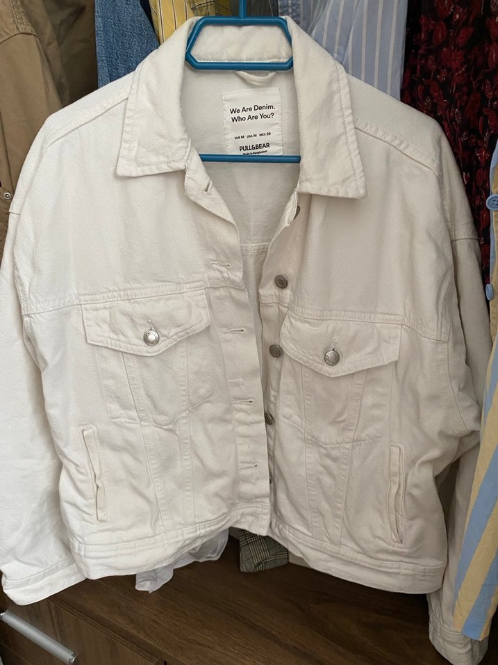 Beyaz, düğmeli ve uzun kollu kadın denim ceket, bol kesimiyle rahat bir görünüm sunar. Oversize kesimdir, günlük sokak stiline uygundur. M bedendir