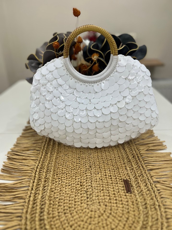 Beyaz pullu ve örgü dokulu kadın çanta, yuvarlak bambu saplı, bohem düğün stili için uygun.