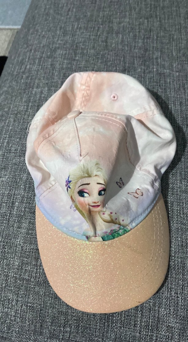 Beyaz sentetik kumaştan, pastel baskılı ve pullu detaylı kız çocukları için şapka. Hafif ışıltılı yüzeye sahip.