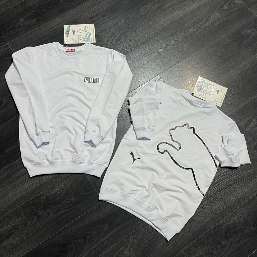 Beyaz renkli Puma baskılı erkek sweatshirt, uzun kollu ve yuvarlak yakalıdır. Pamuk kumaştan üretilmiş, gri baskılı detayları ve kısa kesimi ile rahat bir athleisure tarz sunar. Günlük kullanıma uygundur.