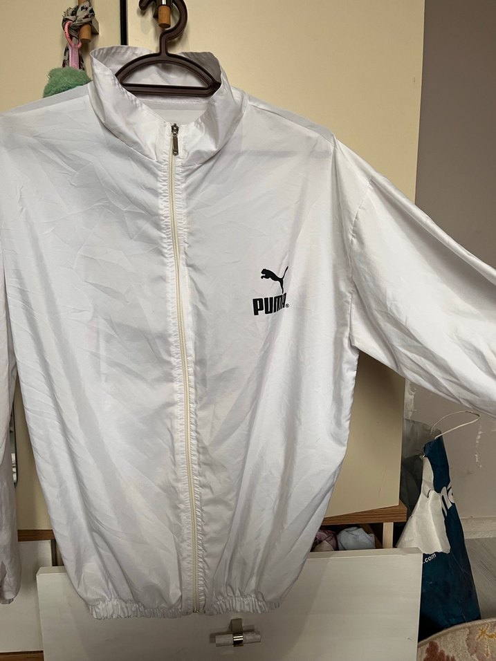 Beyaz PUMA baskılı Unisex yağmurluk, uzun kollu, yüksek yakalı ve bol kesimdir. Sentetik kumaştan üretilmiş, günlük kullanım için uygundur.