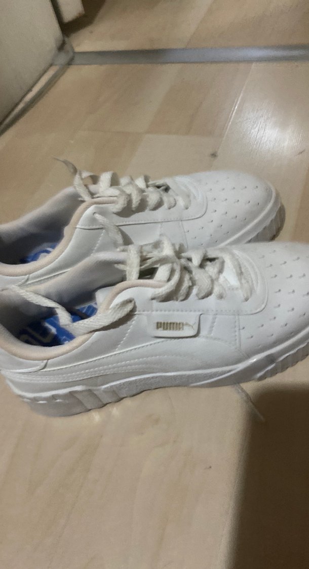 Beyaz Puma kadın spor ayakkabısı, blok topuklu ve kauçuk tabanlıdır. Desensiz tasarımıyla trend ve rahat bir görünüm sunar.