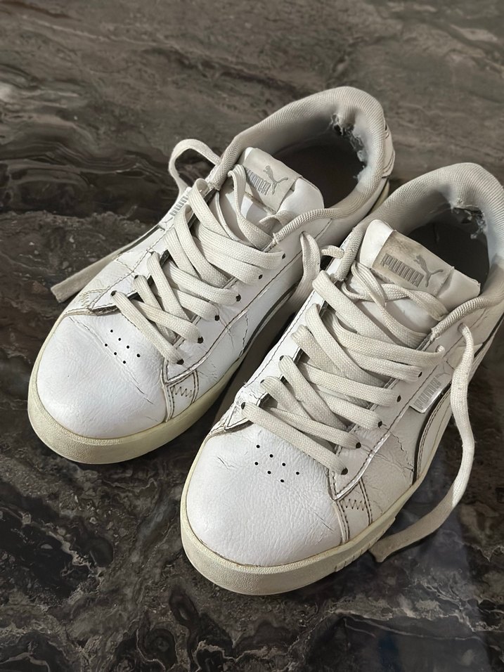 Beyaz Puma kadın spor ayakkabısı, düz kauçuk tabanlıdır. Günlük kullanıma uygun, desen içermeyen ve rahat şıklık sunan trend bir modeldir. Topuk kısımları yırtılmıştır. Görsele ekledim.