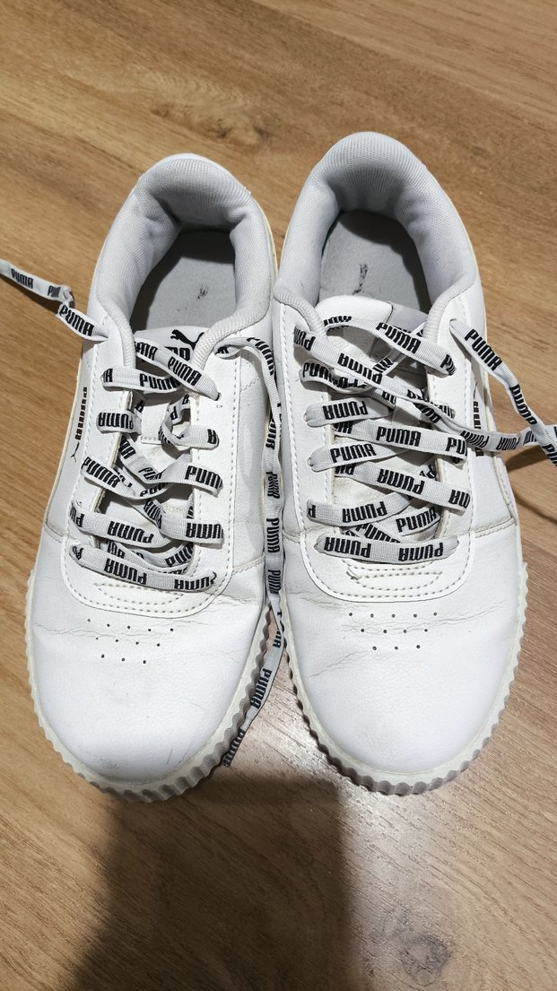 Beyaz Puma kadın spor ayakkabısı, elastik bağcıklı ve düz kauçuk tabanlıdır. Spor ve gündelik şıklık için sade, desensiz tasarım.Çok az kullanıldı