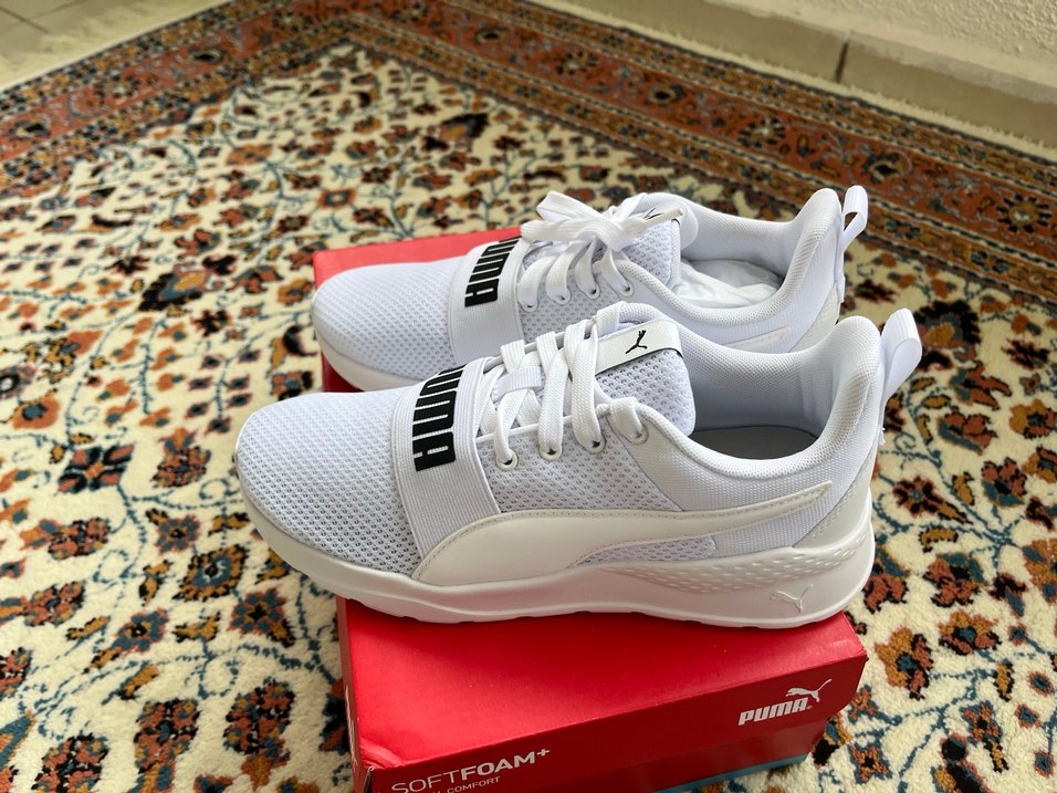 Nefes alabilir kumaş ve lastik tabanlı, platform topuklu ve cırt cırt bantlı beyaz Puma kadın spor ayakkabısı. Spor ve sokak stili için uygundur. 37 numaradır orijinal üründür yenidir uygun fiyata verilecektir