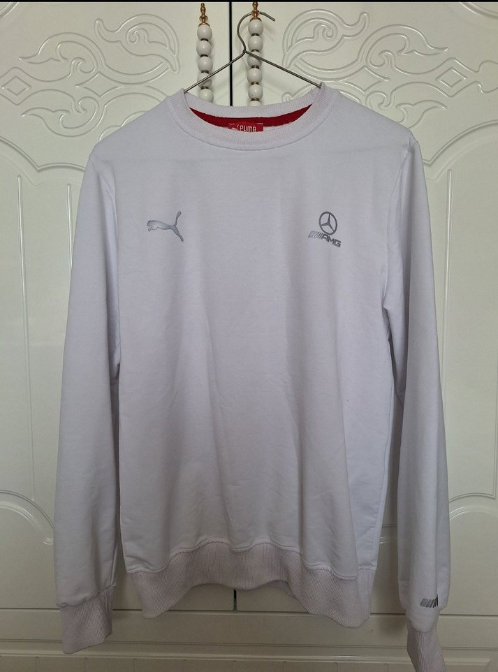 Beyaz Puma sweatshirt, yuvarlak yaka ve uzun kollu, yumuşak kumaştan, bol kesim. Puma ve Mercedes baskılı logolarıyla sportif tarz sunar.