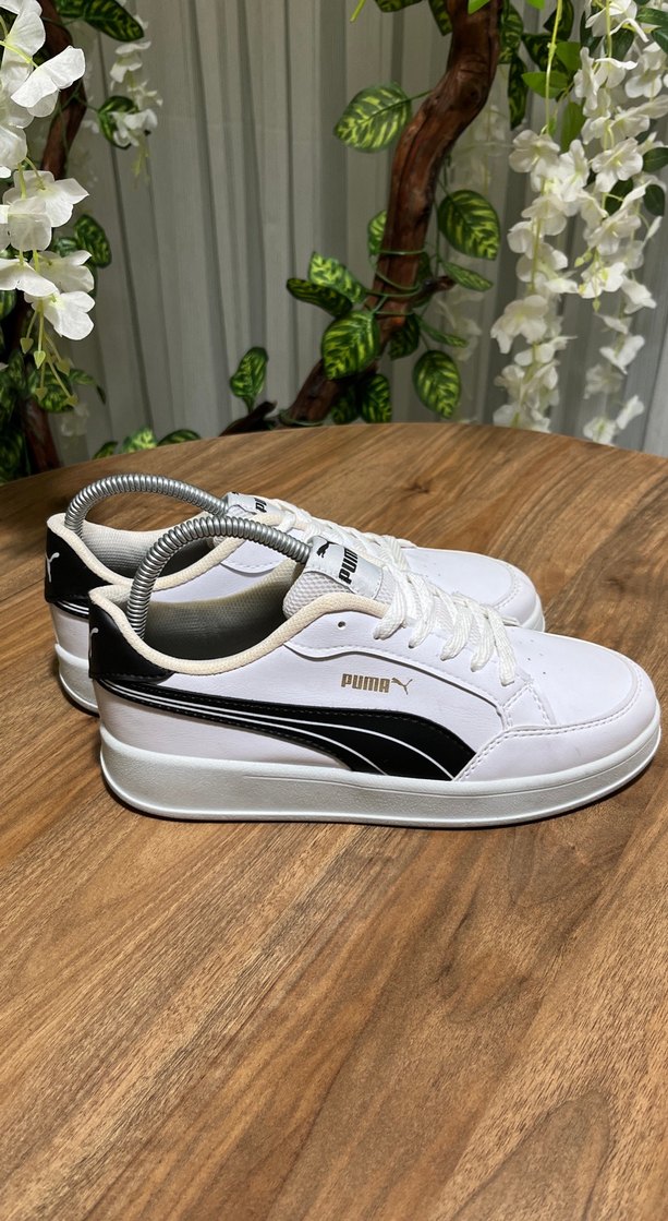 Beyaz Puma spor ayakkabı, platform topuklu ve bağcıklı. Yan taraflarda siyah baskılı detaylar bulunur. Kauçuk tabanlı, spor ve günlük kullanıma uygun.