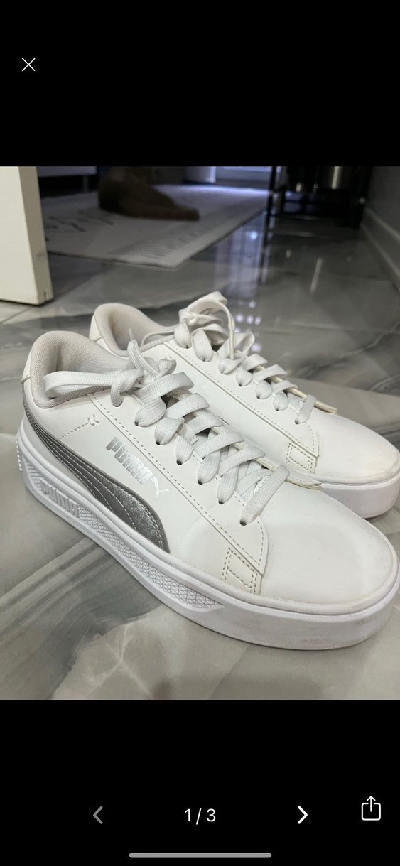 Beyaz Puma spor ayakkabılar, platform topuk ve kauçuk tabanlıdır. Trendy rahat sokak stili ve zahmetsiz şıklık sunar. ️ Orijinal Puma 37 numara güncel fiyatı 2300₺ 2 kere kullanıldı tertemiz sorunsuz
