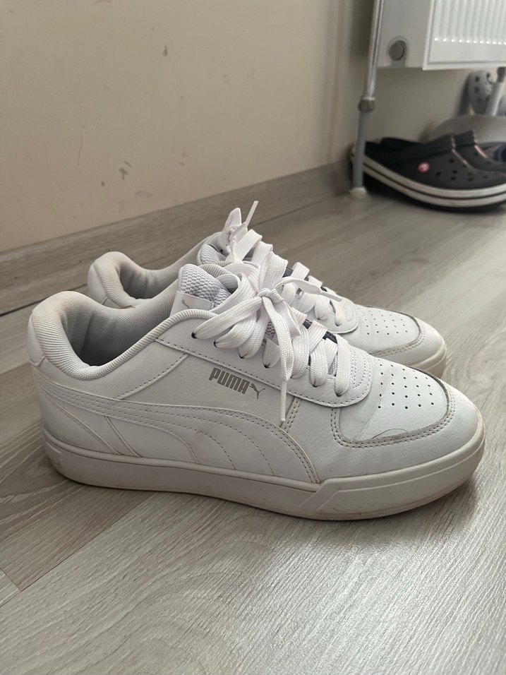Beyaz Puma marka, platform topuklu ve bağcıklı tasarıma sahip, kauçuk malzemeden yapılmış spor ayakkabı. Gri detaylarıyla sade ve desensiz bir görünüme sahip.