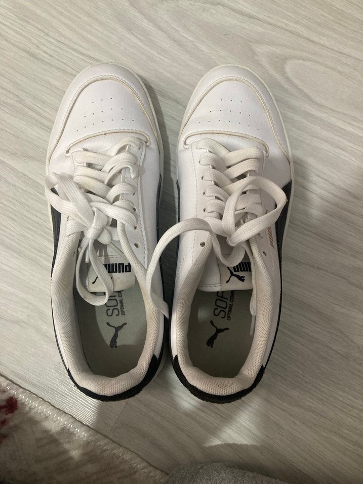 Beyaz Puma spor ayakkabılar, düz kauçuk taban ve velcro detayına sahip. Spor ve günlük sokak stili için uygun, desensiz ve gri tonlu. 39 numara dar kalıp kadın ayakkabısıdır ,dar kalıp olduğu için bir numara büyük almanızı ve taraklı bir ayağa dahipseniz başka ürünler tercih etmenizi tavsiye edeerim