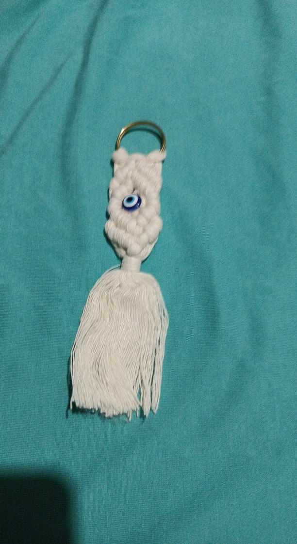 Beyaz renkte, püsküllü ve nazar boncuklu bohem tarzda anahtarlık, retro ve hippie dokunuşlar için uygun.